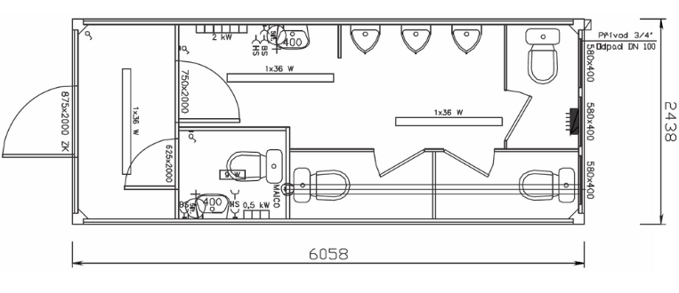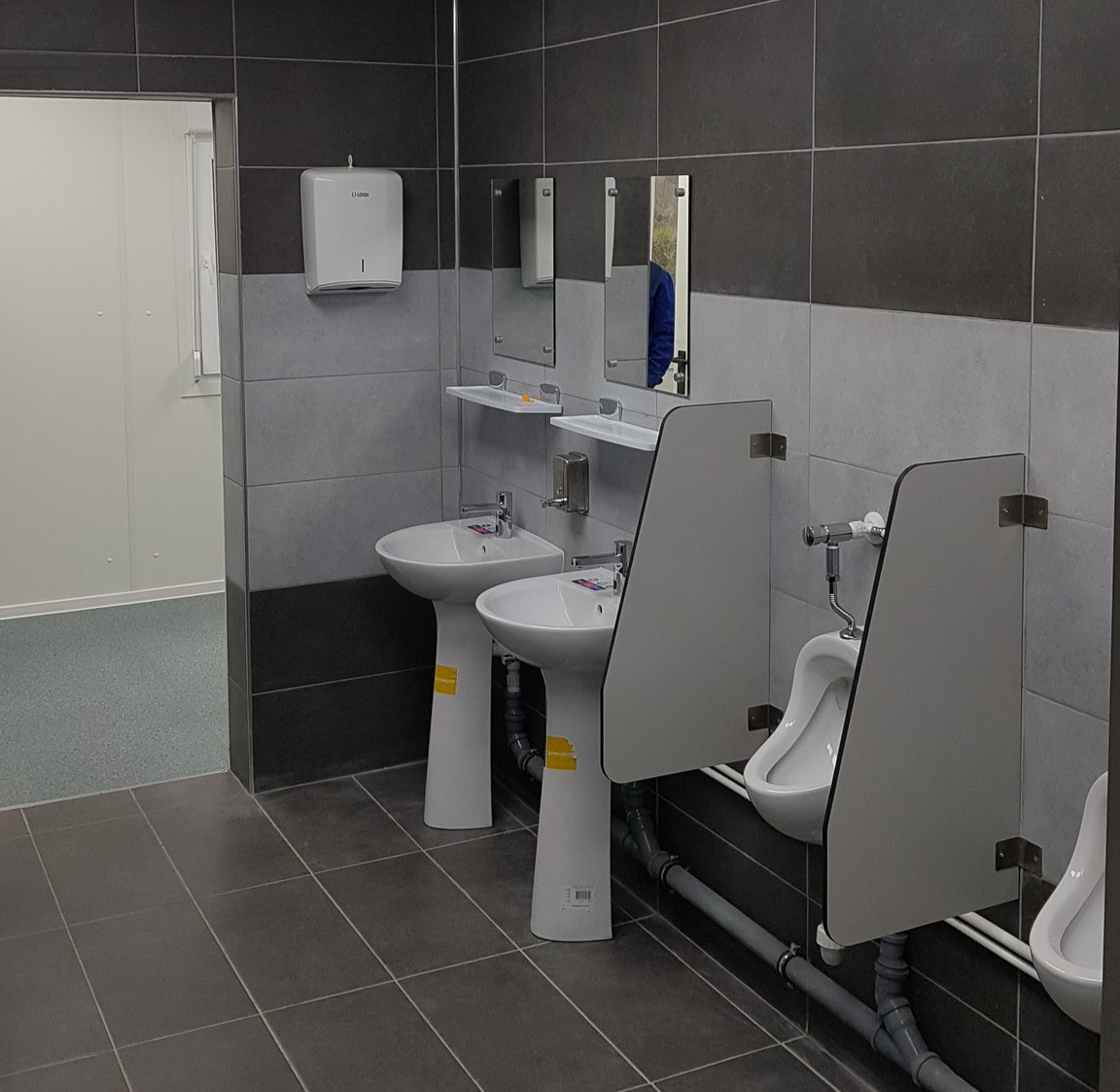 6 cabine toaletă, 3 pisoare, 2 chiuvete, 2 boilere de  5L